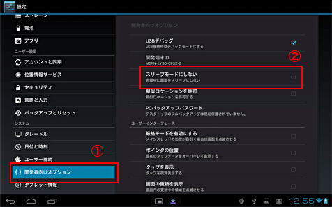 1. 左側の項目にある[開発者向けオプション]をタップし、右側の項目から[スリープモードにしない]をタップします。