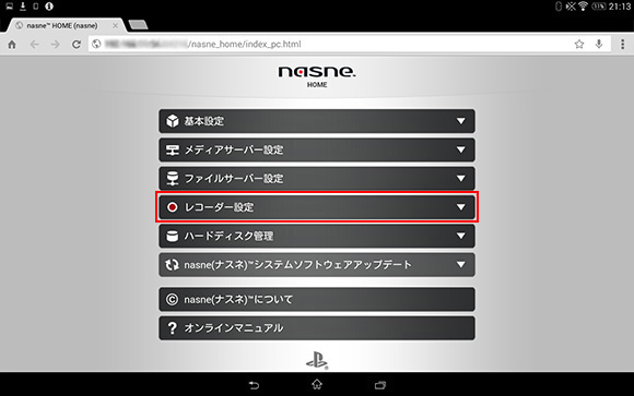- Chromeが起動し、nasne(ナスネ)™HOMEが表示されるので、[レコーダー設定]をタップします。