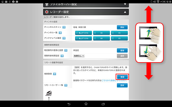 - 「リモート録画予約設定」の項目の中の「機器登録」の右側にある[登録]ボタンをタップします。