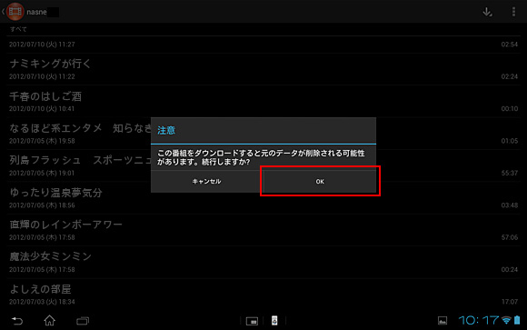 - 「この番組をダウンロードすると元のデータが削除される可能性があります。続行しますか?」と表示されますが、[OK]をタップします。