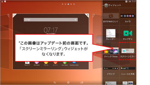 アップデート前は置くことができた、「スクリーンミラーリング」ウィジェットが、アップデート後は置けなくなります(ウィジェット自体がなくなります)。