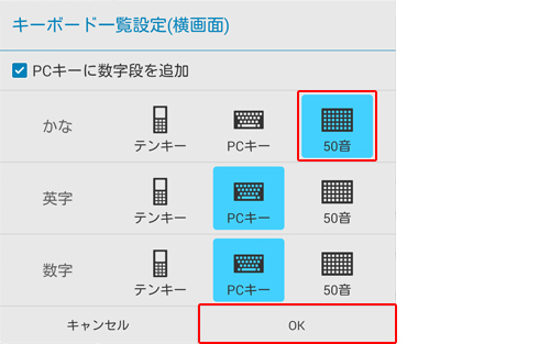 - 「キーボード一覧設定」画面が表示されるので、「かな」の[50音]をタップし、[OK]をタップします。