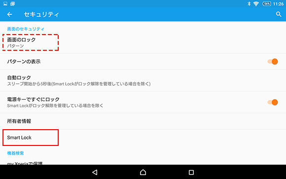 「Smart Lock」は、画面ロックの種類を「パターン」「PIN」「パスワード」のいずれかに設定すると、選択できるようになります。