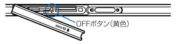 黄色のOFFボタンを先の細いもので約3秒間押し、 3回振動した後に離す