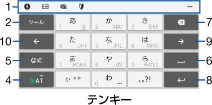 テンキー | 携帯電話と同じ配列のキーボードです。キーを繰り返しタップして文字を選択します |