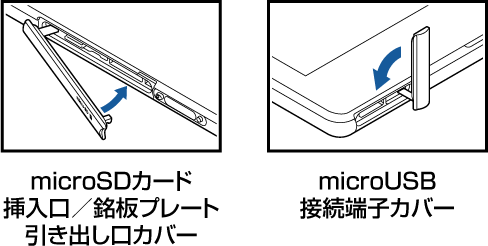microSDカード挿入口/銘板プレート引き出し口カバー、 microUSB接続端子カバーの開閉はしないでください。