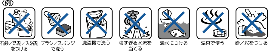 塩水や海水、 清涼飲料水がかかったり、 泥や土などが付着したりした場合には、 すぐに洗い流してください。乾燥して固まると、 汚れが落ちにくくなり、 傷や故障の原因となります。 熱湯に浸けたり、
