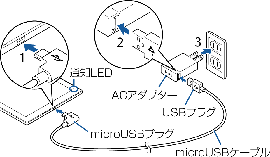 充電には本体付属のACアダプターやmicroUSBケーブルをご使用ください。対応充電器以外をご使用になると、
