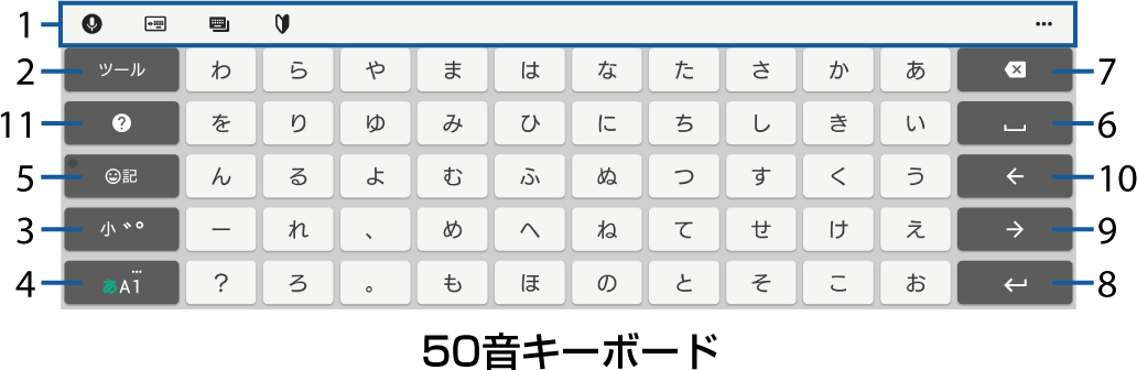 50音キーボード | 50音順/アルファベット順に並んだキーボードです。 |