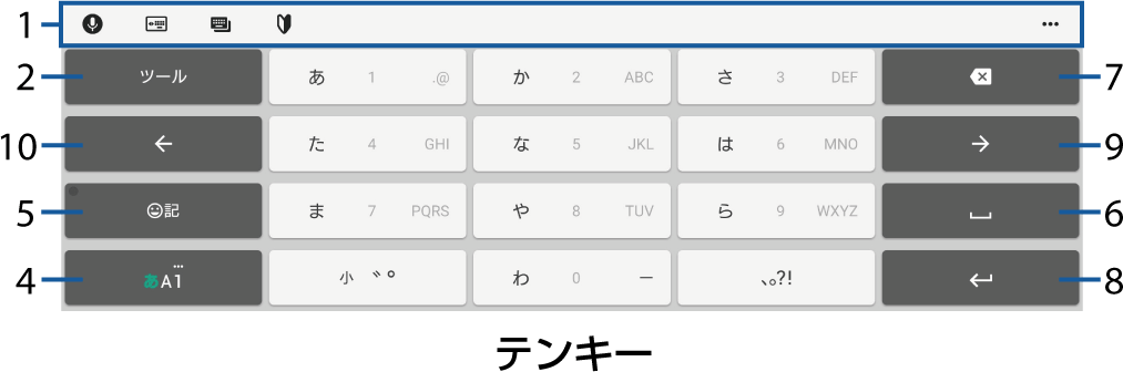 テンキー | 携帯電話と同じ配列のキーボードです。キーを繰り返しタップして文字を選択します |