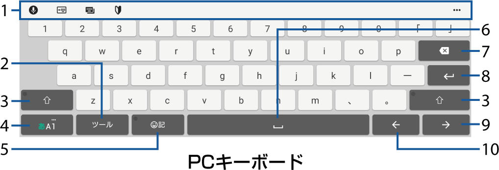 PCキーボード | 一般的なパソコンと同じ配列のキーボードです。日本語はローマ字で入力します。フリック入力もできます。 |
