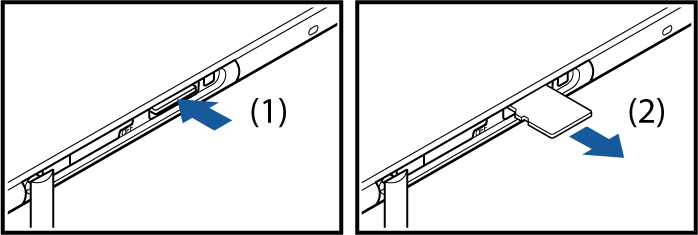 microSDカードをカチッと音がするまで奥へ押し込み (1)、 ゆっくり引き抜く (2)