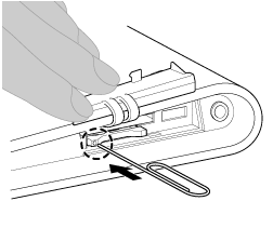 クリップなどの細いピン*の先を、SIMカード取り出しボタン穴に入れて押し込む。