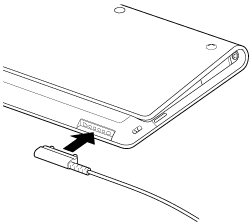 タブレットデバイスを裏返し、図のように差し込み口の向きに注意して、ACアダプターをつなぐ。
