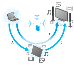 コンピューターやオーディオ機器などのサーバーに保存しているコンテンツを、タブレットデバイスを使ってテレビなど別の機器に送って再生できます。