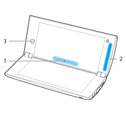 タブレットデバイスを縦にして使うときは、前面カメラが下に来るように持ってください。照度センサーを手で覆わないようにしてください。