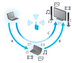 コンピューターやオーディオ機器などのサーバーに保存しているコンテンツを、タブレットデバイスを使ってテレビなど別の機器に送って再生できます。