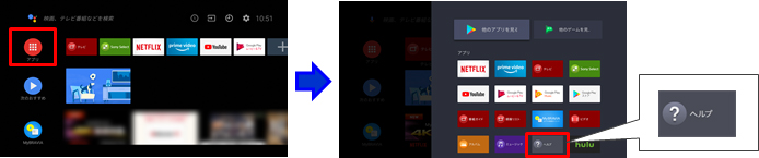 * [ヘルプ]を選びリモコンの「決定」ボタンを長押しし、[お気に入りに追加]を選ぶと、アプリ列に常に表示できます。