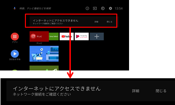 ブラビアがネットワーク(インターネット)に接続されていないときに、ホームメニューに「インターネットにアクセスできません」などのエラーメッセージが表示されます。[閉じる]を選ぶとメッセージを一時的に消すことはできますが、ネットワーク接続するまで、このメッセージを非表示にすることはできません。