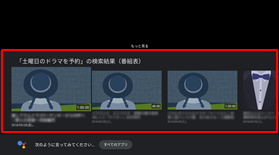 テレビ視聴中にリモコンのマイクボタンを押して、例えば「土曜日のドラマを予約」と話すと、候補の番組が一行目に表示されるようになります。また、キーワード検索を行うと、現在の放送中の番組だけでなく、録画した番組も検索結果に表示されるようになります。