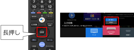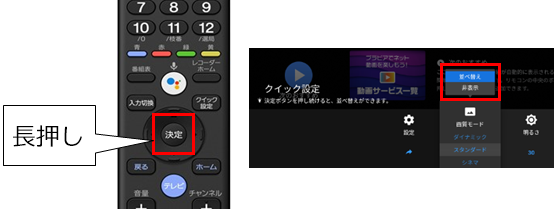 - メニュー内の各項目を選んでいるときに、リモコンの「決定」ボタンを長押しし、[並び替え]を選ぶと、表示順の並び替えができるようになります。