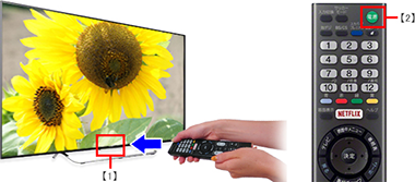 リモコンをテレビ前面のLED(【1】)に向け、「電源」ボタン(【2】)を「長押し」します。