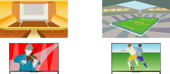 - 視聴している内容に連動して、[シーンセレクト]の設定を自動で切り換えます。デジタル放送視聴中は番組表のジャンル情報と連動して、[シネマ]、[スポーツ]、[ミュージック]、[アニメ]に切り換わります。HDMI入力のときは、つないだ機器からの情報によって、自動で切り換わることがあります。