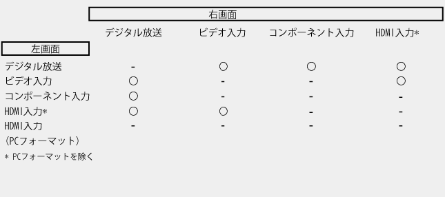 - PCフォーマット信号は、2画面(左右画面)で表示できません。