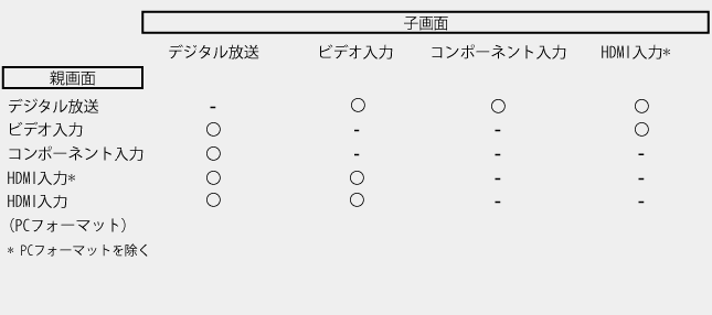 - 2画面(親子画面)時に、親/子画面にそれぞれ異なる垂直周波数の信号(例:親画面 24p、子画面 60i)を表示させた場合、子画面映像の滑らかな動きが損なわれることがあります。