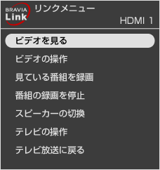 ブラビアリンクで操作できる機器が表示されます。操作したい機器を選ぶと機器の電源が入り、本機の入力が切り換わります。 - ビデオの操作