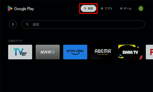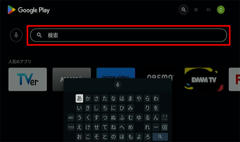 リモコンの→ボタンで検索ボックスを選択し、画面下に表示されるソフトウェアキーボードを使用してアプリ名を入力する。入力後は、「決定」ボタンを押す