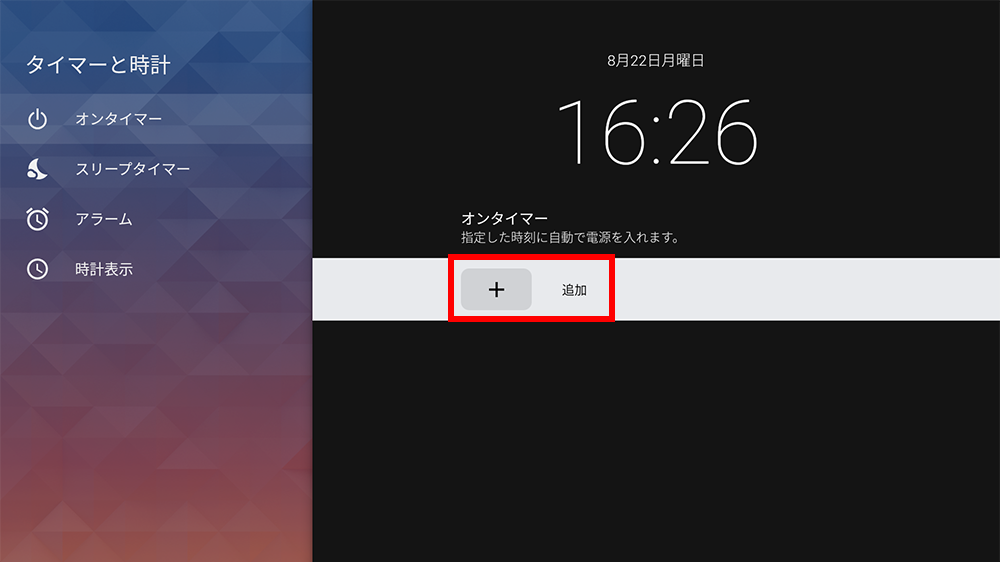 - 新しくタイマーを設定するには、画面中央の「+追加」を選び、「決定」ボタンを押します。