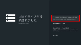 「USBドライブが接続されました」の画面で、[「メディアプレーヤー」でコンテンツを見る]を選び、「決定」ボタンを押してください。