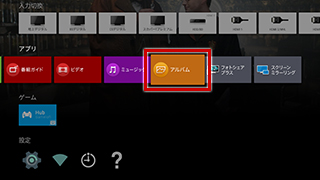 リモコンの「ホーム」ボタンを押し、「アルバム」アプリを選び、「決定」ボタンを押します。