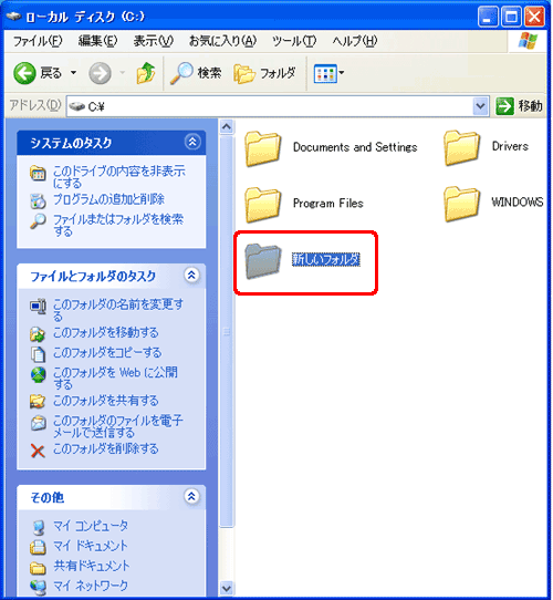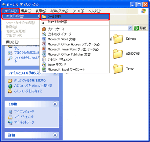 - 「ローカルディスク(C:)」の内容が表示されたら、[ファイル(F)] メニューをクリックし、[新規作成(N)] をクリックします。次に表示されたメニューから、[フォルダ(F)] をクリックします。