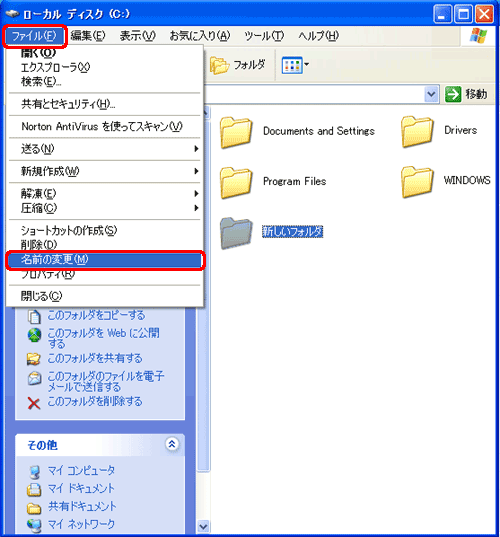 - [ファイル(F)] をクリックし、[名前の変更(M)] をクリックします。