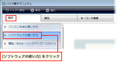 [バイオ電子マニュアル]が起動します。[目次]タブの、[ソフトウェアの使い方]をクリックします。