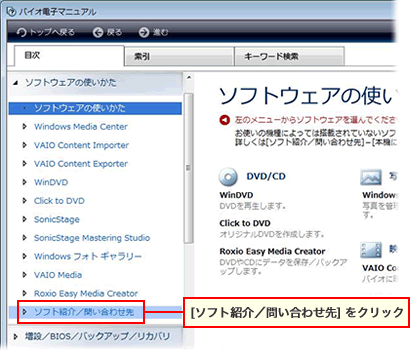 [電子マニュアル]を使用し、付属ソフトウェアのお問い合わせ先を確認するには以下の手順を実行します。