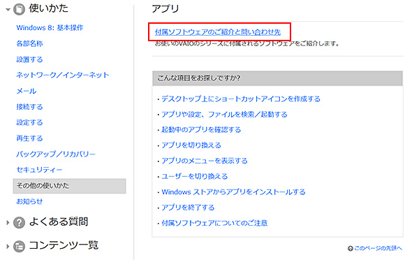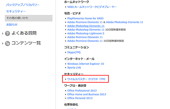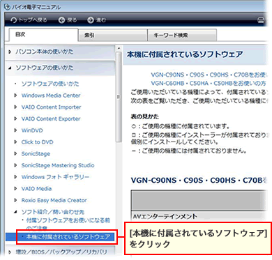 [本機に付属されているソフトウェア](Windows7の場合[付属ソフトウェアの紹介とお問い合わせ])をクリックします。画面右側にソフトウェアの詳細が表示されます。
