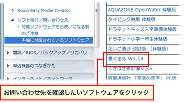 お問い合わせ先を確認したいソフトウェアをクリックします。