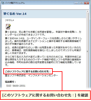 [バイオ電子マニュアル]画面で、[このソフトウェアに関するお問い合わせ先:]を確認します。