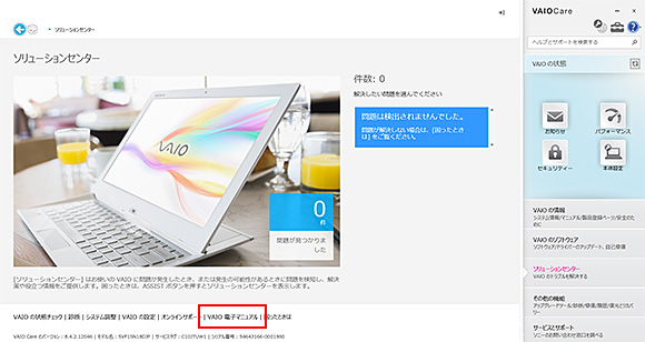 「VAIO Care」の[ソリューションセンター]画面が表示されるので、画面下の[VAIO 電子マニュアル]を選択します。