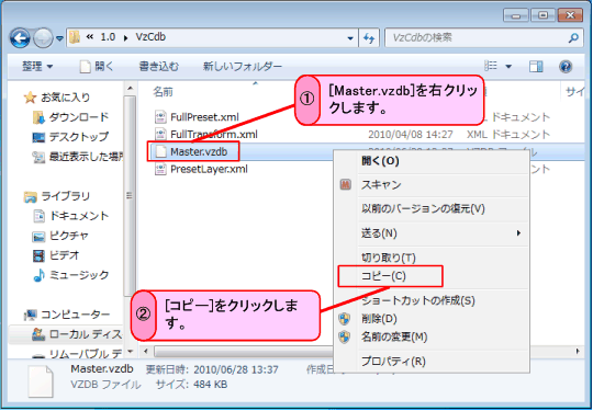 - [Master.vzdb]を右クリックし、[コピー]をクリックします。