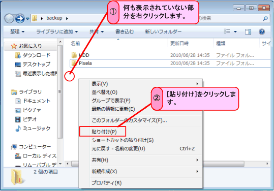 - フォルダー内の何もない部分を右クリックし、[貼り付け]をクリックします。