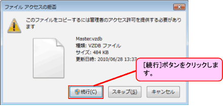 - [ファイル アクセスの拒否]画面が表示されるので、[続行]ボタンをクリックします。