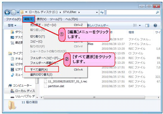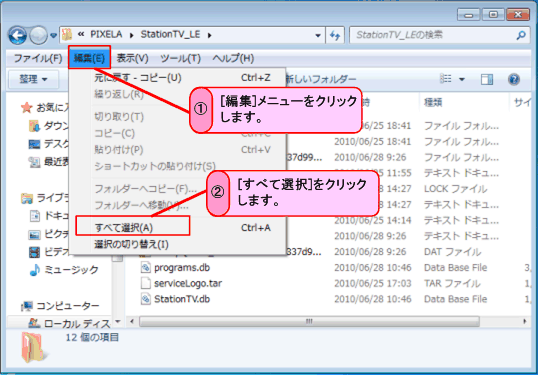 - [編集]メニューをクリックし、[すべて選択]をクリックします。フォルダー内のファイルが全て選択されます。