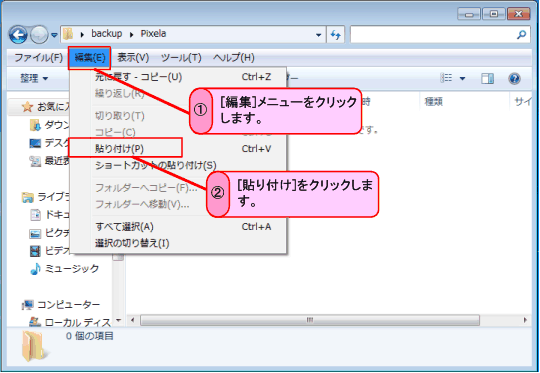 - 「手順2 バックアップデータを保存するフォルダーを作成します」で作成した[Pixela]フォルダーを開きます。