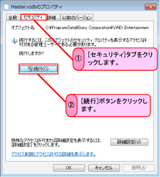 - [Master.vzdbのプロパティ]画面が表示されるので[セキュリティ]タブをクリックし、[続行]ボタンをクリックします。