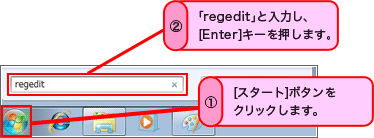 [スタート]ボタンをクリックし、[プログラムとファイルの検索]欄に「regedit」と入力し、[Enter]キーを押します。