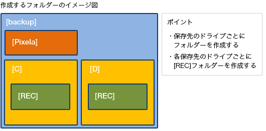 (例:Cドライブに録画している場合は、「C]というフォルダーを作成します)